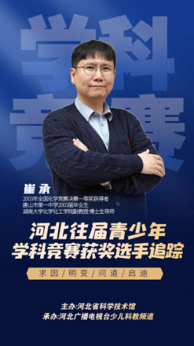 我是崔承,现任湖南大学化学化工学院副教授、博士生导师。高中时期参加化学竞赛的经历令我至今难忘——那段时光让我领略了化学的魅力,从严谨的理论到绚丽的实验,都让我深深着迷。竞赛中我有幸结识北京大学、南开大学、北京师范大学等知名学府的多位前辈学者,感受到他们治学的严谨和育人的热情,也结识了一批志同道合的同窗好友,如今我们仍在不同领域为化学事业而奋斗,时时交流畅谈思想与收获。通过全国决赛获得一等奖、入选国家集训队,我最终保送清华大学,继续化学的学习和实践。