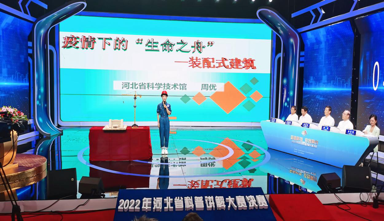 决赛现场,来自中国科学院、中国地质科学院、省科学院、中国留学人才基金会“一带一路”研究院、河北广播电视台的5位专家组成评委团,针对讲解作品进行了专业点评和提问。周优同志的决赛参赛作品为《疫情下的“生命之舟”—火神山医院》,结合疫情讲述了装配式建筑“用建筑为生命争取时间”的惊心动魄,结合塔吊、建筑模型、积木等道具生动有趣地讲解了装配式建筑的原理和特点。面对专家对集装箱与装配式建筑关系的提问,从专业和科普的角度回答了目前装配式建筑的常见形式,并列举了生活中常见的例子,得到各位专家的充分肯定。