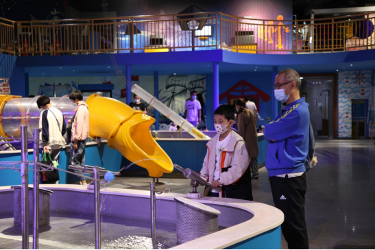 展厅内,家长陪着孩子专注的游览每一个展品,一起动手操作各种展品设备,有图文并茂的海洋知识,有惊险刺激的高压放电表演,还有通过动手实践体验机械原理……许多孩子按捺不住内心的兴奋,热烈地与父母讨论,全身心投入到参观体验活动之中。