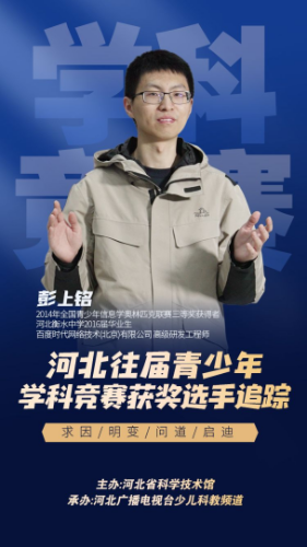 发布时间:2025-12-22人物简介 彭上铭,2014年全国青少年信息学奥林匹克联赛三等奖获得者,河北衡水中学2016届毕业生,中国地质大学(武汉)软件工程专业毕业,百度时代网络技术(北京)有限公司高级研发工程师。